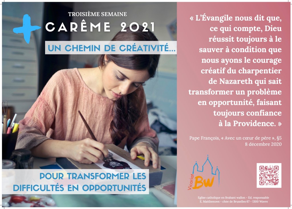Nous vous présentons ci-dessous l’affiche de la troisième semaine de Carême proposée par le Vicariat. Pour rappel, le Vicariat du Brabant Wallon vous propose des vidéos et des lectures sur le site http://www.confinement-bw.be.