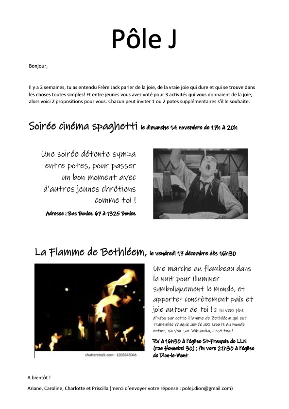 Accueilli par Père Philibert, 19 jeunes étaient réunis à Dion le Val. Frère Jack Mardesic, franciscain au couvent St-Antoine à Bruxelles est venu avec plusieurs jeunes postulants pour nous parler de la joie qui dure et qui se trouve dans les choses toutes simples de nos vies!