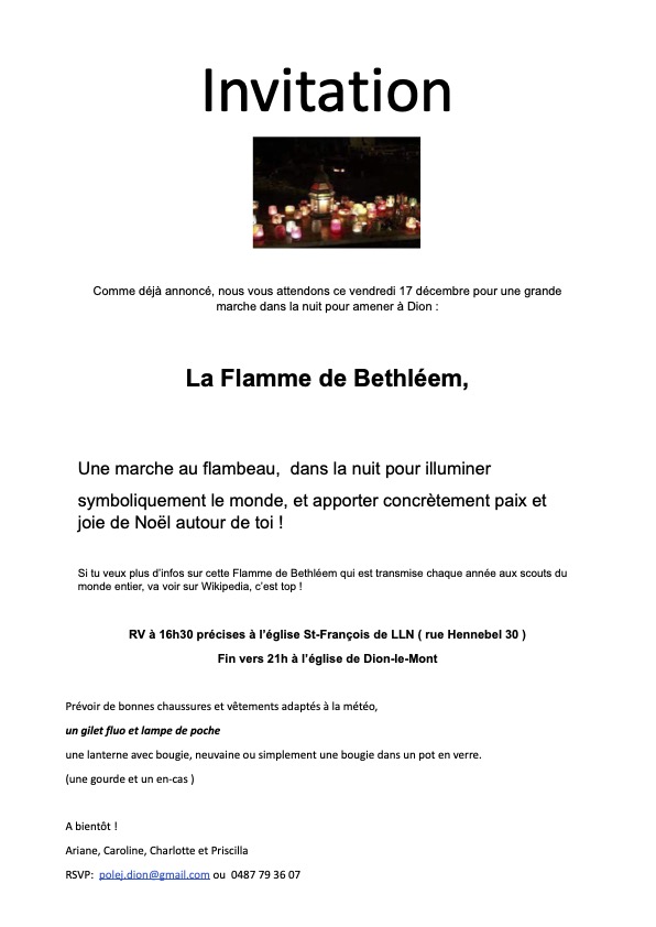 Comme déjà annoncé, nous vous attendons ce vendredi 17 décembre à 16h30 précises à l’église St-François de LLN pour une grande marche dans la nuit pour amener la flamme de Bethléem à Dion.