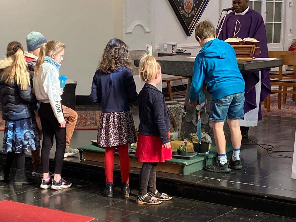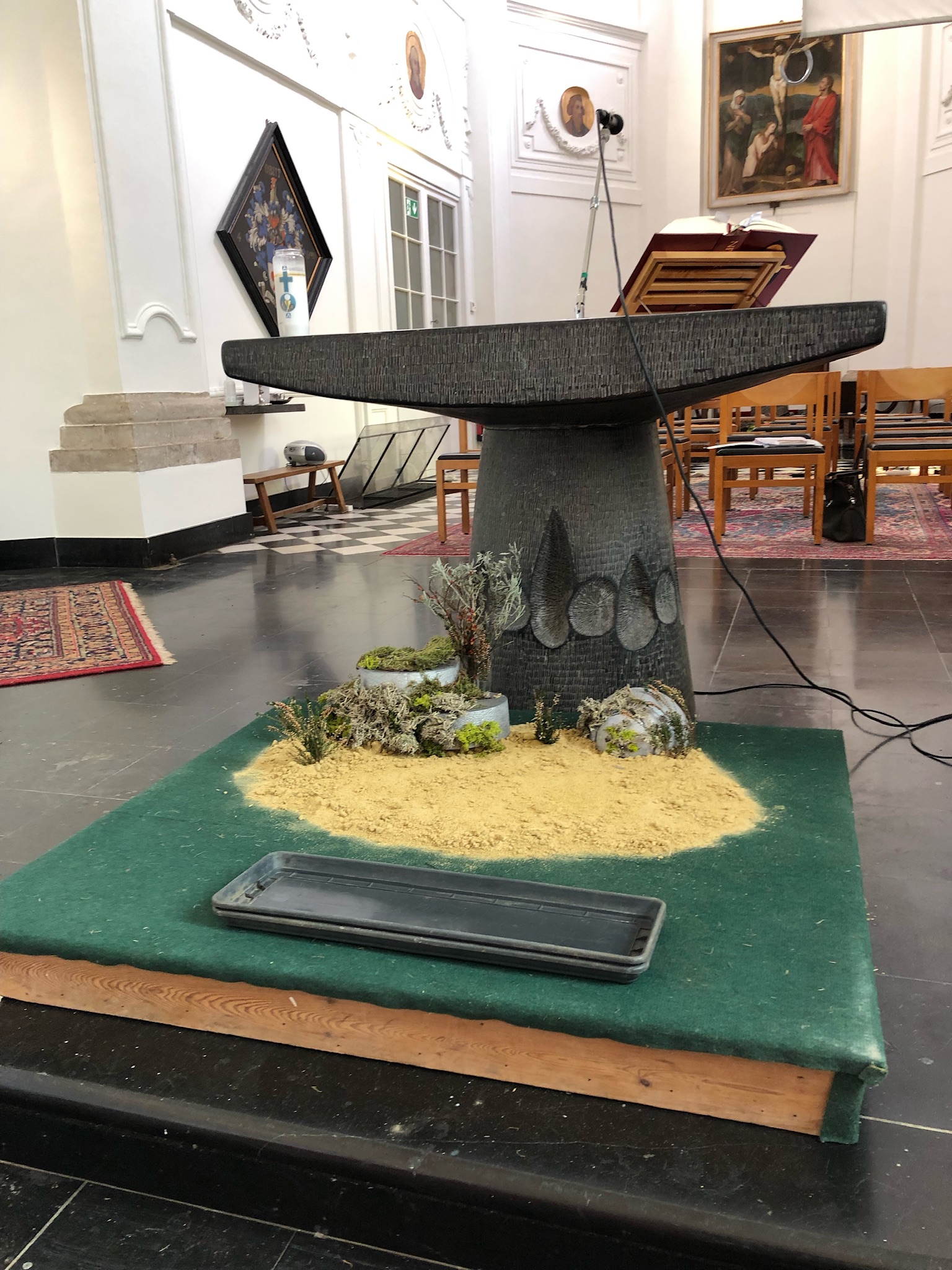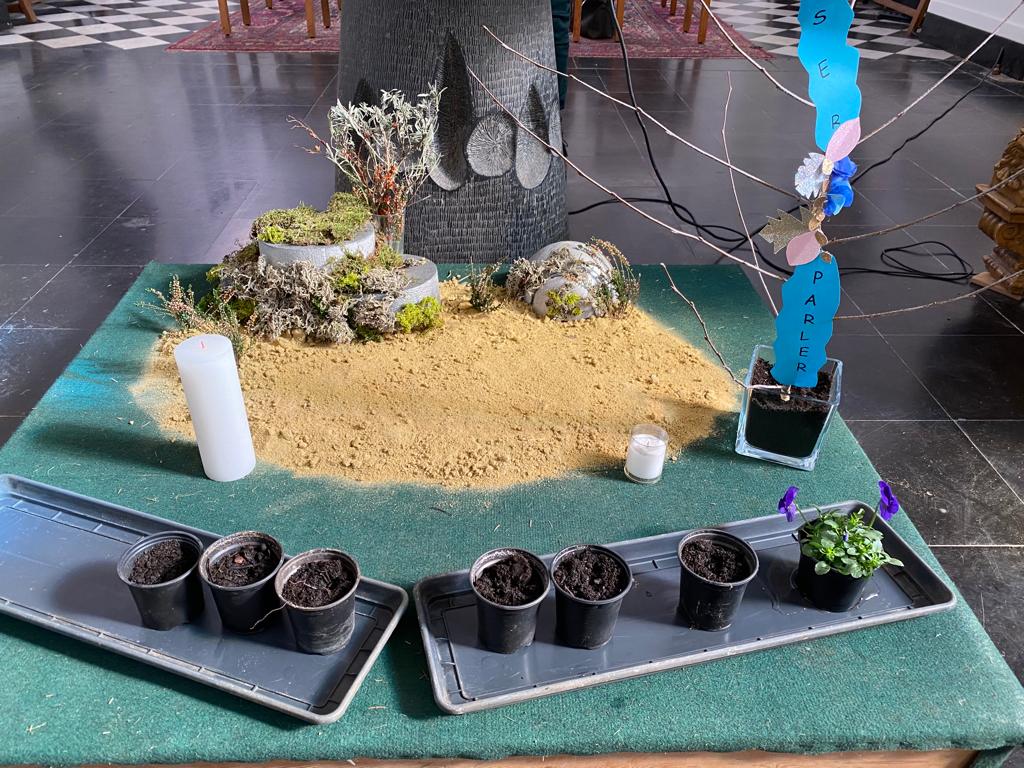 Ce dimanche, au début de la messe, nous pouvions voir un désert aride devant l’autel. Durant les lectures et l’homélie, les enfants ont été invités à la sacristie pour une explication de l’évangile du jour. Ils sont ensuite revenus avec de petits pots remplis de terre où ils avaient planté des graines et les ont disposés devant le désert. Chaque dimanche, ils vont maintenant arroser ces pots pour en faire sortir de jolies fleurs. Ils ont également apporté une branche d’arbre avec un thème auquel ils vont faire attention pendant la semaine.