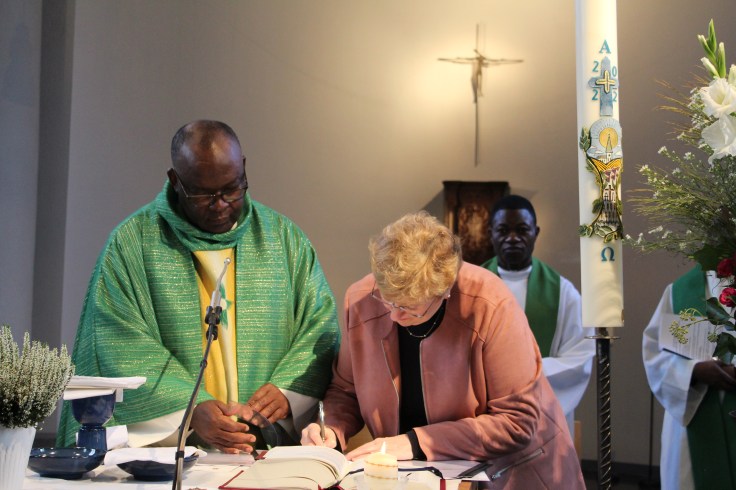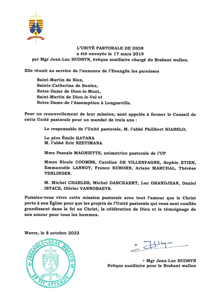 Cette célébration était également l’occasion de renouveler le mandat de l’Unité Pastorale pour 3 nouvelles années. Les membres du Conseil de l’Unité Pastorale (CUP) ont signé la nouvelle charte et reçu la lettre de mission de Monseigneur Hudsyn. Vous trouverez la charte et la liste des membres du CUP ici.