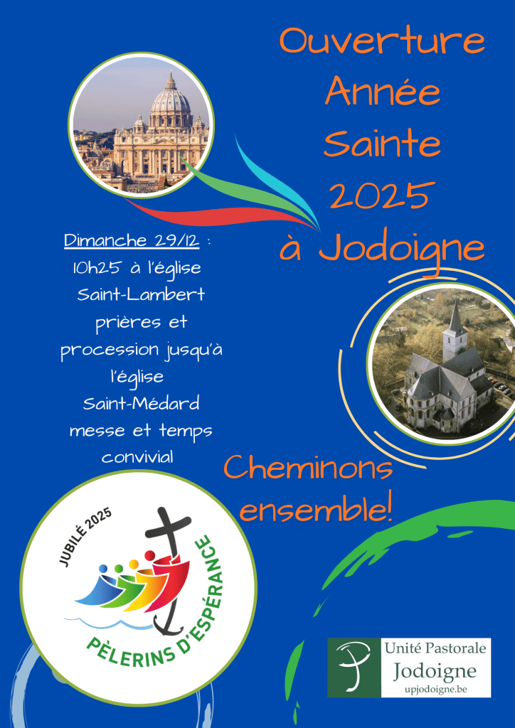 Chers paroissiens et paroissiennes de l’Unité Pastorale de DION, vous êtes tous conviés à Jodoigne le dimanche 29 décembre 2024 à l’église Saint-Lambert à 10H25 pour la procession suivie de la messe d’ouverture du Jubilé 2025 à l’église Saint-Médard à 11H00. Jodoigne est l’église jubilaire pour notre doyenné. Bienvenue à tous et toutes pour représenter notre UP !