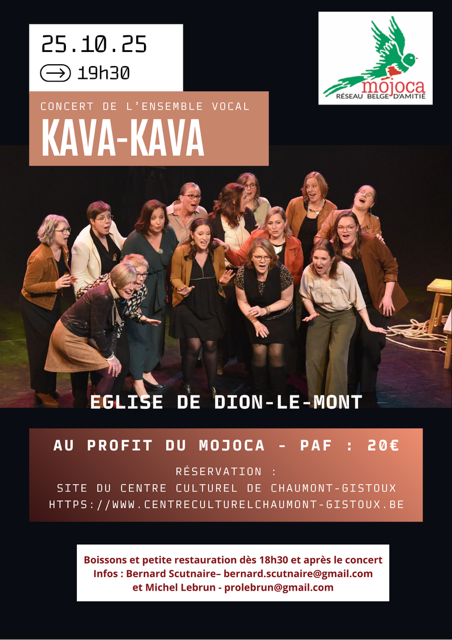 L’ensemble vocal Kava-Kava se produira le 25 octobre, à 19h30 à l’église Notre-Dame de Dion-le-Mont au profit du MOJOCA. PAF : 20 € – Boissons et petite restauration dès 18h30 et après le concert.